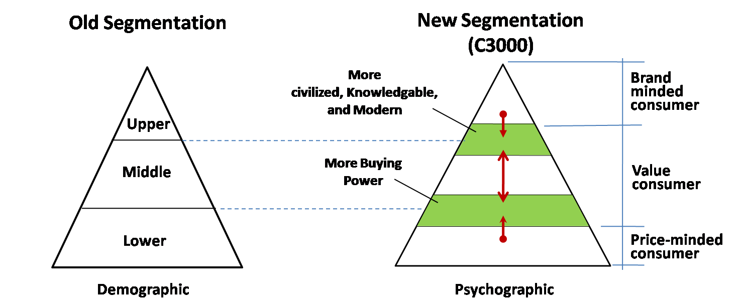 Bagan 1 memberikan gambaran mengenai perubahan segmentasi lama (demografi) ke baru (psikografi) dengan adanya Consumer 3000. Secara demografi segmentasi secara sederhana hanya dibagi menjadi segmen kelas atas (upper), menengah (middle), dan bawah (lower). Sementara secara psikografi segmen dibagi menjadi “brand-minded consumer” di segmen atas, value consumer di segmen tengah, dan price-minded consumer di segmen bawah. Yang pertama adalah segmen yang semata-mata melihat brand saat memutuskan pembelian; segmen kedua melihat value (benefit yang didapat dan harga yang dibayar); sementara segmen ketiga hanya melihat harga.