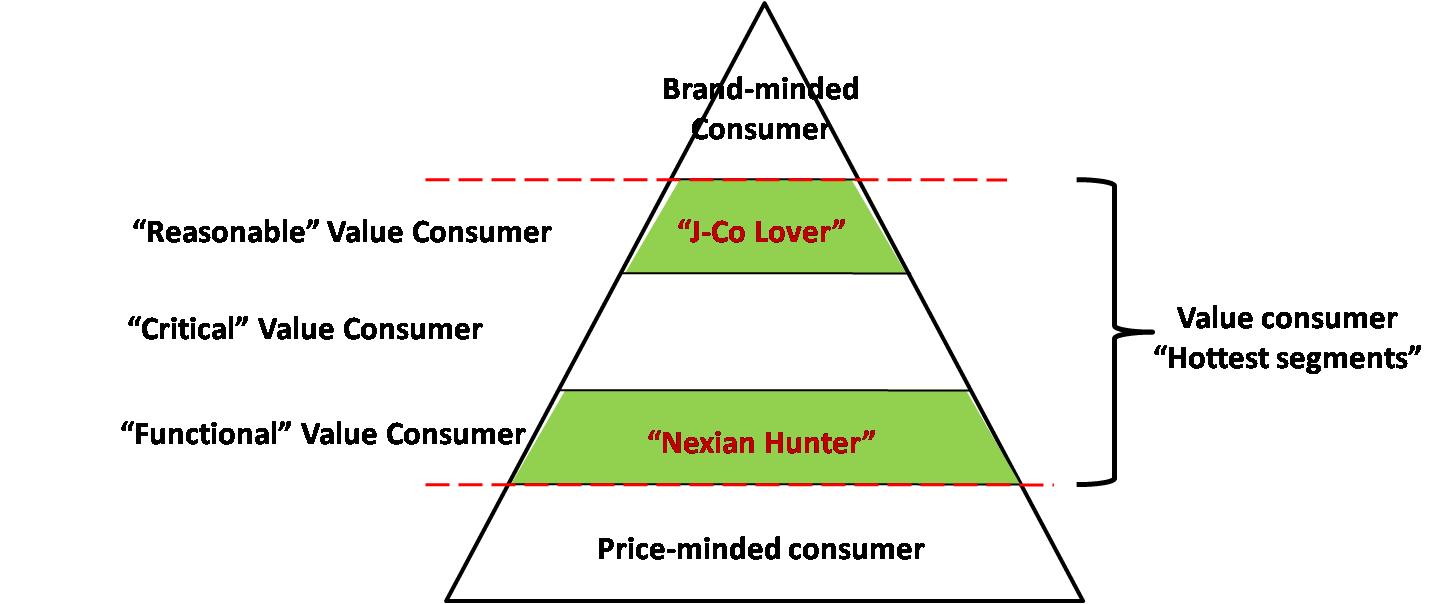 Sementara “functional value consumer” adalah konsumen yang mementingkan fungsi (functional benefit) yang memadai dengan harga yang terjangkau. Mereka tak begitu peduli dengan brand hebat. Konsumen jenis ini awalnya adalah price-minded consumer, tapi seiring dengan naiknya daya beli, mereka mulai naik kelas memburu produk-produk yang menawarkan fungsionalitas baik, tidak asal murah. Kalau disuruh memilih Nexian atau Blackberry, maka konsumen jenis ini akan memilih Nexian yang memiliki fitur dan fungsi yang setara dengan Blackberry tapi dengan harga yang jauh lebih murah. Untuk mudahnya segmen ini saya beri nama”Nexian Hunter”.