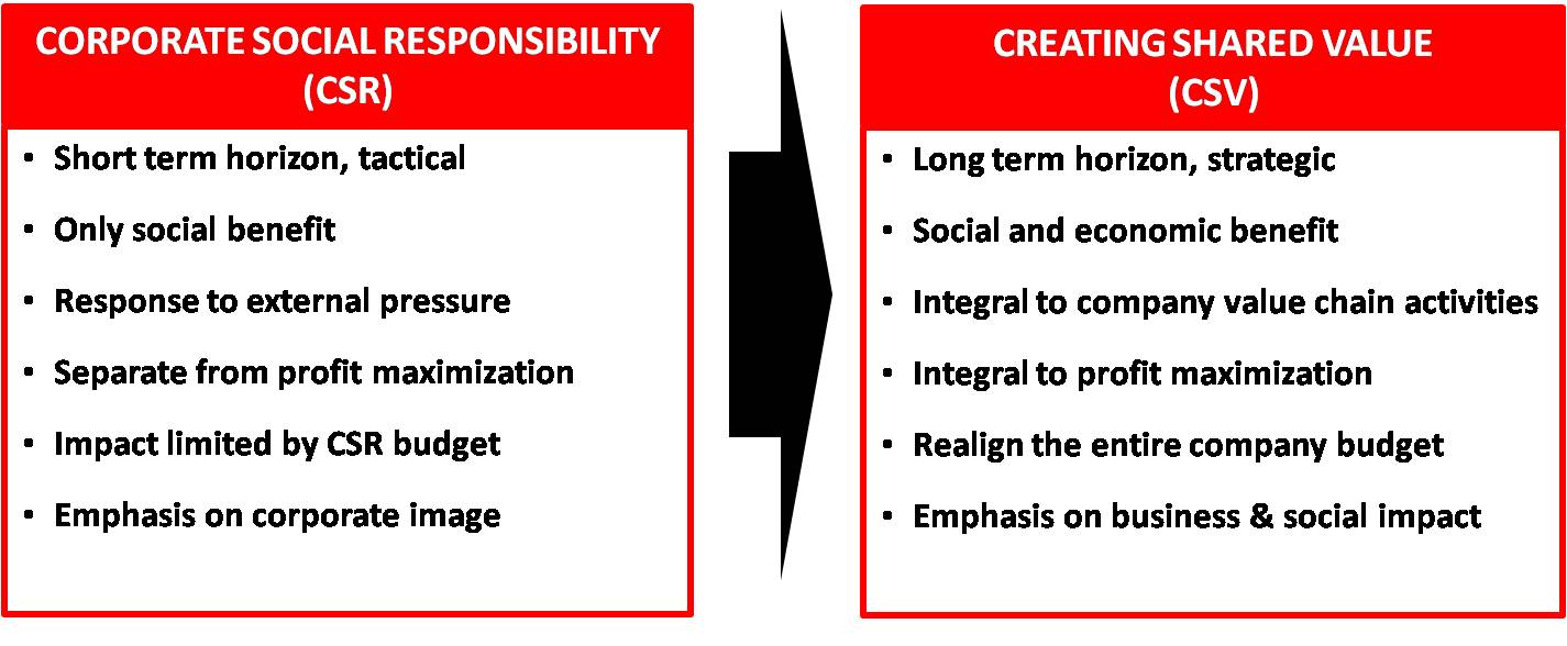 CSV sebaliknya, dilaksanakan dengan niatan mulia untuk memecahkan persoalan-persoalan sosial yang selaras dengan upaya untuk menghasilkan profit. Kata Porter, “companies can create economic value by creating societal value”. Jadi penyelesaian persoalan sosial tidak ditempatkan sebagai aktivitas sampingan, tapi dilaksanakan sepenuh hati sebagai bagian dari misi dan eksistensi perusahaan.